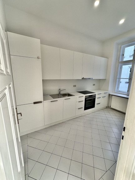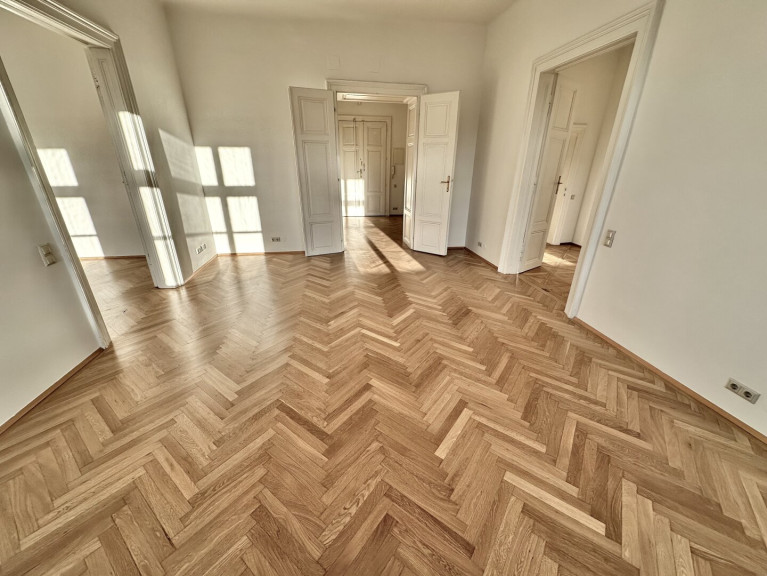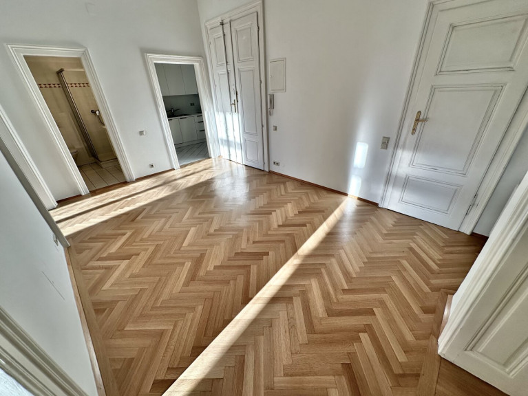 Im 3. Liftstock eines prächtigen Stilaltbaus gelegen, verbindet sie klassische Altbauarchitektur – weiße Flügeltüren, hohe Räume, Altwiener Parkett – mit einer anspruchsvollen, hochwertigen Sanierung.