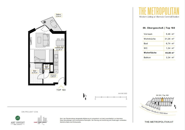 Hippe Cafés, coole Bars und jede Menge Unbeschwertheit: The Metropolitan liegt an der schillernden Vienna Central Station zwischen dem modernen Quartier Belvedere und dem grünen Sonnwendviertel. Hier können Sie abseits des Mainstreams der Stadt abhängen und originelle Shops, Lokale, Kunst- und Kulturangebote sowie Frischluft in grünen Parkanlagen vor der Haustüre genießen. Zahlreiche attraktive Plätze laden zum Verweilen, Bewegen und Staunen ein. In nur wenigen Schritten sind die Bezirke Wieden, Landstraße und das historische City Center erreichbar. Ob Tennis im Arsenal, zeitgenössische Kunst im Belvedere 21 oder ein Cocktail auf der Rooftop-Bar gegenüber – in der Karl-Popper-Straße 5 kann man eins werden mit dem pulsierenden Stadtleben und zwischendurch Ruhe in den benachbarten und üppig grünen Parks finden. Alles ist möglich – an diesem einmaligen Standort.