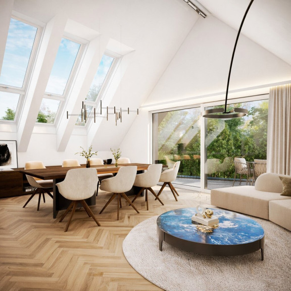 Das Herzstück der Wohnung bildet der beeindruckende, rund 44 m² große Wohn- und Essbereich mit integrierter Küche. Große Dachflächenfenster sorgen für eine außergewöhnliche Lichtfülle und verleihen dem Raum eine offene, luftige Atmosphäre. Von hier aus gelangen Sie auf die südwestlich ausgerichtete Terrasse mit ca. 25 m². Ergänzt wird das Raumangebot durch zwei helle Kinderzimmer zu je rund 10,30 m², von denen eines ebenso ideal als Gästezimmer oder Homeoffice genutzt werden kann. Ein eigenes Badezimmer für die Kinderzimmer sowie ein praktischer Abstellraum komplettieren den harmonischen Grundriss.
