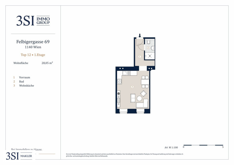 Die Wohnung verfügt über einen Vorraum, ein modernes Badezimmer sowie eine gut geschnittene Wohnküche, die trotz kompakter Größe ein angenehmes und funktionales Wohngefühl vermittelt.