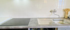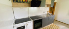 - Küche mit moderner Einbauküche, Tischherd und große Eckbankgruppe