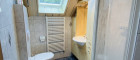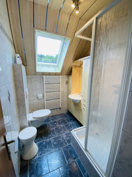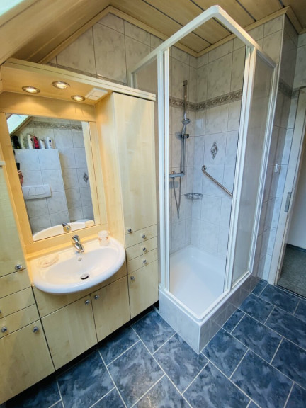 - Badezimmer mit Waschtisch, Dusche und WC