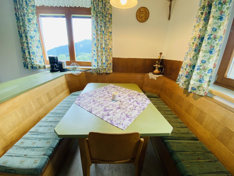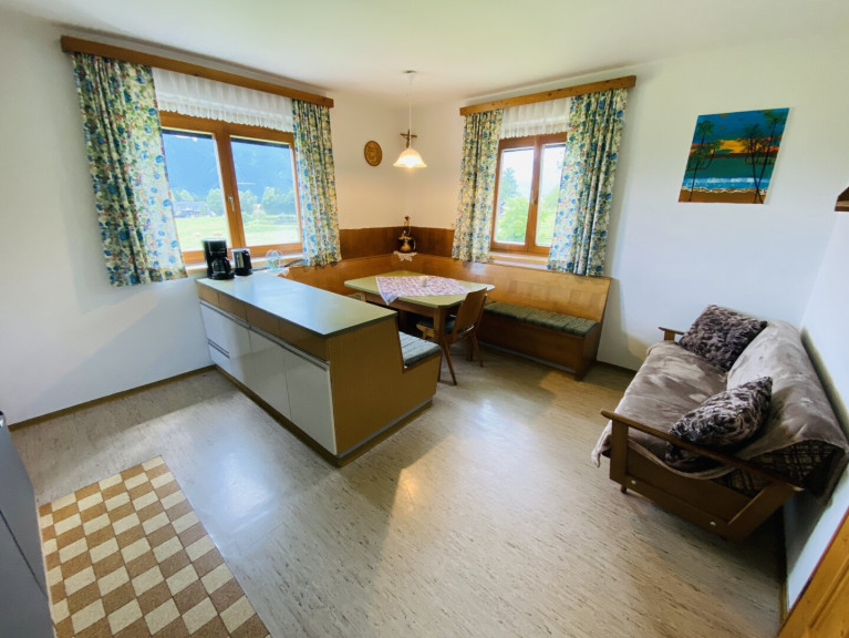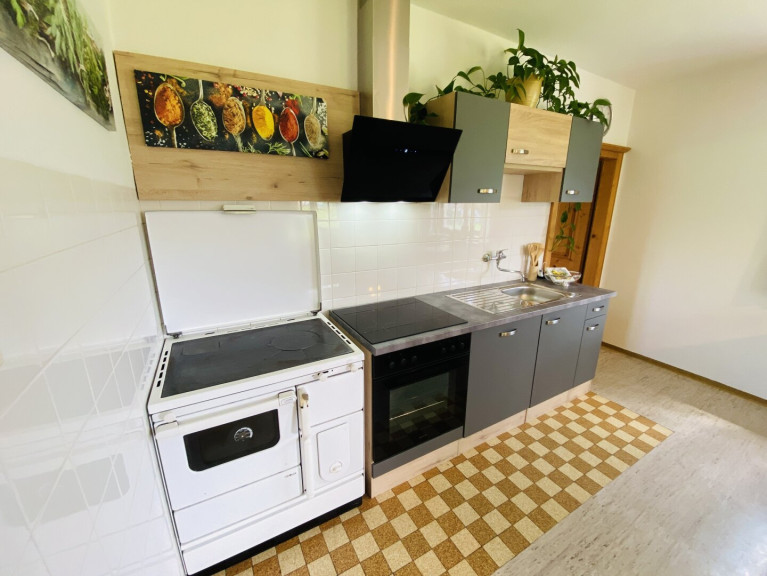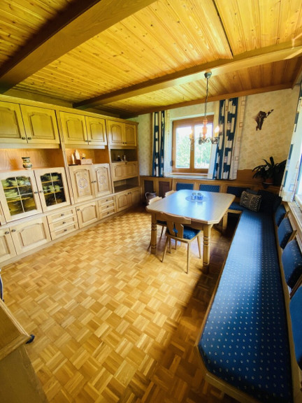 Die Küche bildet einen zentralen Treffpunkt im Haus. Sie ist mit einer modernen Einbauküche ausgestattet und verfügt zusätzlich über einen Tischherd, der mit Holz beheizt werden kann. Eine großzügige Eckbankgruppe bietet Platz für gemeinsame Mahlzeiten. Von der Küche gelangt man direkt in das Wohnzimmer, das mit einem klassischen Vollholzverbau ausgestattet ist und eine behagliche Wohnatmosphäre schafft. Ein Schlafzimmer sowie ein Badezimmer und ein separates Gäste WC befinden sich ebenfalls im Erdgeschoss.