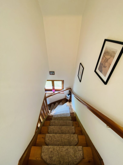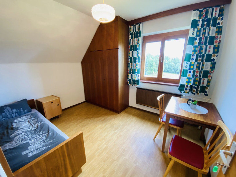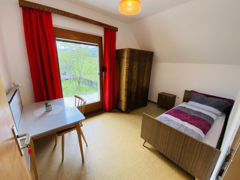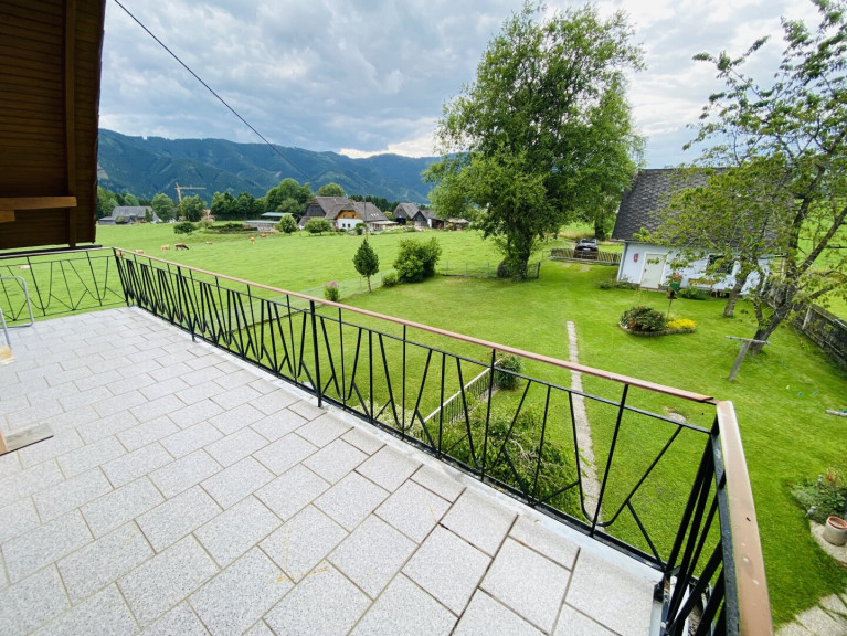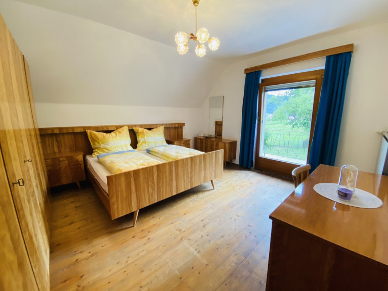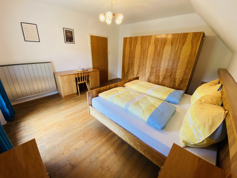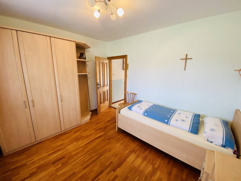 Im Obergeschoss stehen vier weitere Schlafzimmer zur Verfügung. Zwei davon sind als Doppelzimmer, zwei als Einzelzimmer ausgeführt. Ein modernes Badezimmer mit Waschtisch, Dusche und WC ist vom Vorraum aus erreichbar. Von einem der Schlafzimmer gelangt man auf einen rund 13 Quadratmeter großen Balkon, der einen schönen Ausblick auf die umliegende Landschaft bietet.