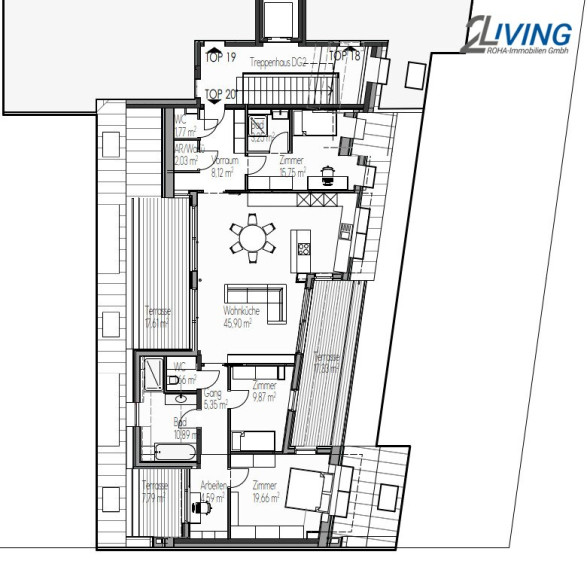 Der offene Wohn-Essbereich mit ca. 46 m² bildet das Herzstück der Wohnung. Durch die großflächigen Verglasungen und mehrere Ausgänge auf die insgesamt 3 umlaufenden Terrassen mit insgesamt ca. 42,73 m² entsteht – insbesondere bei geöffneten Türen – der Eindruck eines nahezu durchgängigen Wohnraums. Innen- und Außenbereich gehen fließend ineinander über und lassen die Wohnung noch größer und luftiger wirken.