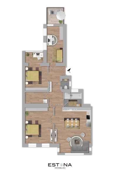 Die ca. 109 m² große Wohnung befindet sich im 3. Stock eines gepflegten Altbauhauses und gliedert sich wie folgt: