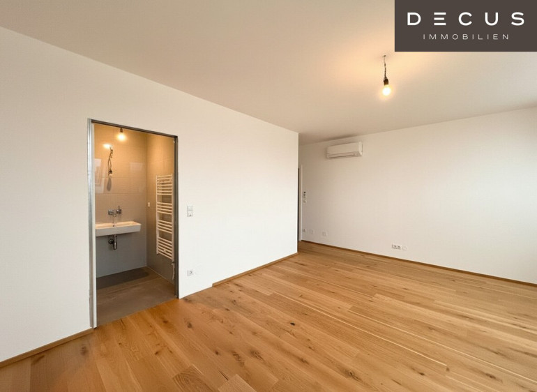 Das Herzstück der Wohnung bildet der weiträumige Wohnbereich, der sich durch seine Helligkeit, die exklusive Materialwahl und den direkten Terrassenzugang auszeichnet. Die Südterrasse eröffnet einen herrlichen Blick über die Dächer der Leopoldstadt und lädt zu sonnigen Nachmittagen und entspannten Abenden ein.