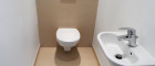 Beim Betreten der Wohnung gelangen Sie in einen großzügigen Vorraum, der durch eine kleine Trennwand strukturiert ist und viel Platz für eine Garderobe bietet. Gleich links befindet sich ein praktischer Abstellraum mit Waschmaschinenanschluss. Daran anschließend liegen ein separates WC mit Handwaschbecken sowie das Badezimmer, welches mit zwei Handwaschbecken, Badewanne und einer Dusche ausgestattet ist.