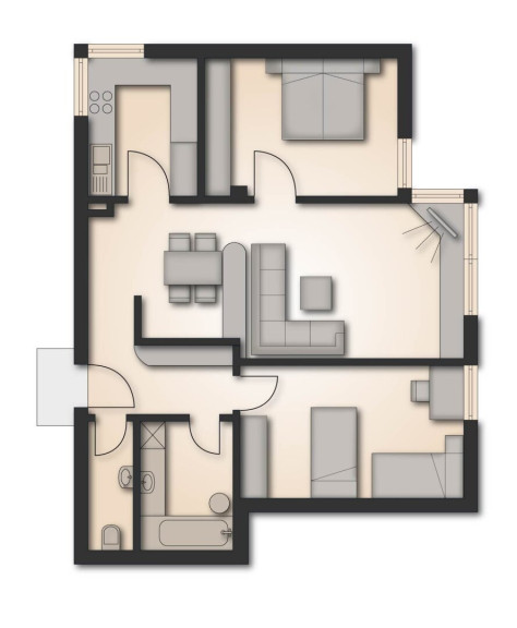 Der großzügige Wohn-Essbereich bildet das Herzstück der Wohnung und bietet viel Platz für gemeinsames Wohnen und Entspannen. Die separate, möblierte Küche mit Fenster ist funktional gestaltet und angenehm hell. Zwei gut geschnittene Schlafzimmer lassen sich flexibel als Schlaf-, Kinder- oder Arbeitszimmer nutzen. Ein Badezimmer mit Badewanne sowie ein separates WC runden das Raumangebot komfortabel ab.