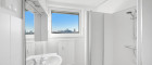 - Badezimmer mit Dusche, Waschbecken und Waschmaschinenanschluss