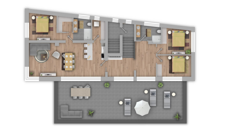 Penthouse: Atemberaubende 82m² Terrasse mit weitem Blick über die Umgebung – der perfekte Ort für Sonnenuntergänge, private Stunden und stilvolle Empfänge.