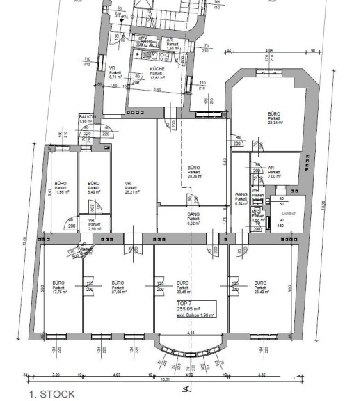 Das Büro verfügt über insgesamt 9 getrennt begehbare Zimmer, welche eine vielseitige Nutzung und individuelle Raumgestaltung ermöglichen. Ein kleiner Balkon mit ca. 2 m², ausgerichtet in den ruhigen Innenhof, bietet eine angenehme Rückzugsmöglichkeit.