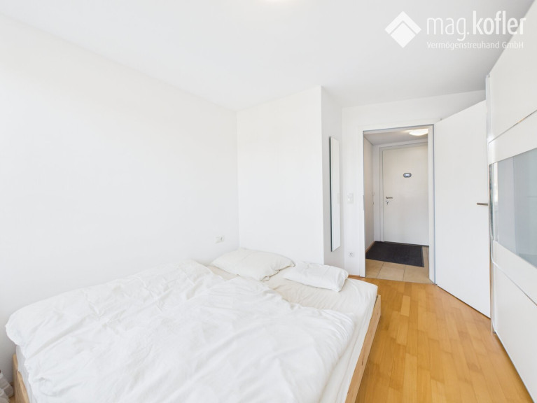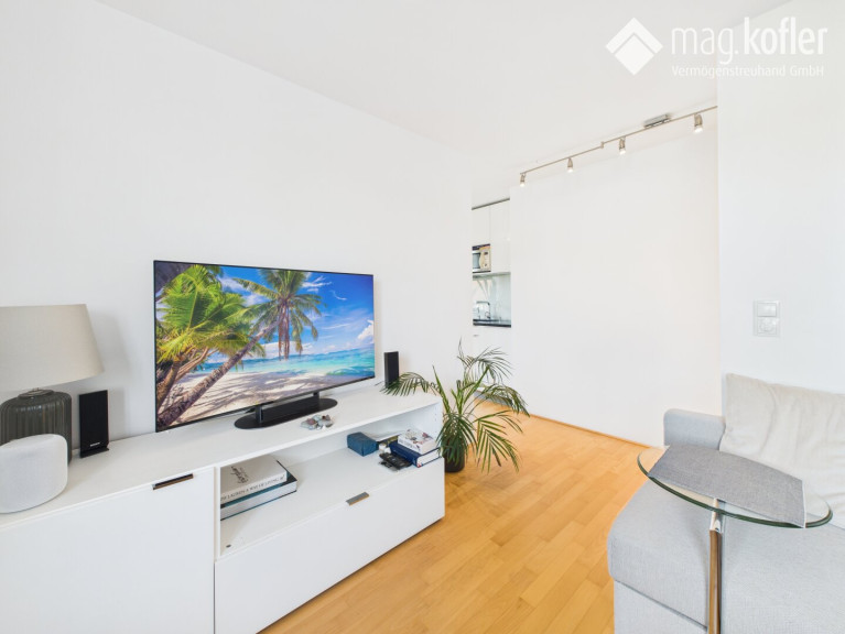 Der Wohnbereich mit direktem Zugang zum Balkon bietet einen atemberaubenden Blick auf die umliegenden Berge – der perfekte Ort zum Entspannen und Wohlfühlen. Ein separates Schlafzimmer, ein Badezimmer und eine kompakte Küche runden das Raumangebot ideal ab.