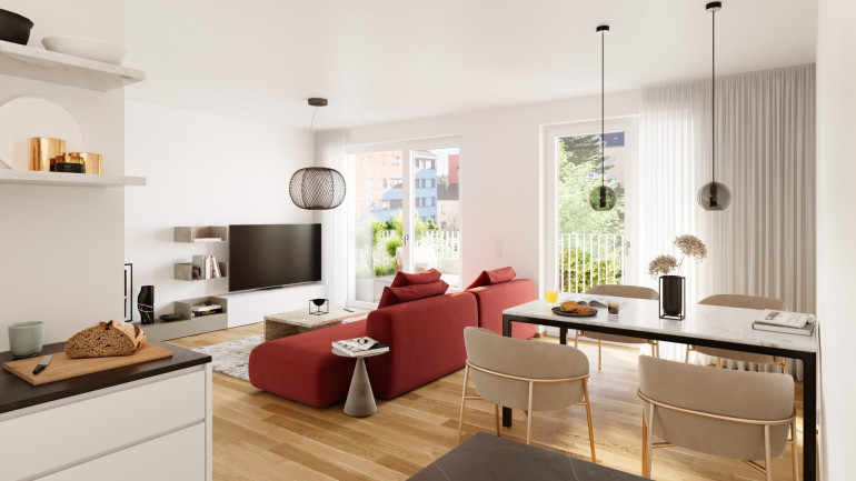 Zudem bietet der Vorraum Zugang zu dem Wohn-, Ess- und Kochbereich, der eine kompakte Küchenzeile vorsieht. Das Schlafzimmer ist vom Wohnbereich erreichbar. Von beiden Räumen ist der großzügige Balkon zugänglich. Die großen Balkontüren durchfluten die gesamte Wohnung mit ausreichend Tageslicht und schaffen so eine hohe Lebensqualität.