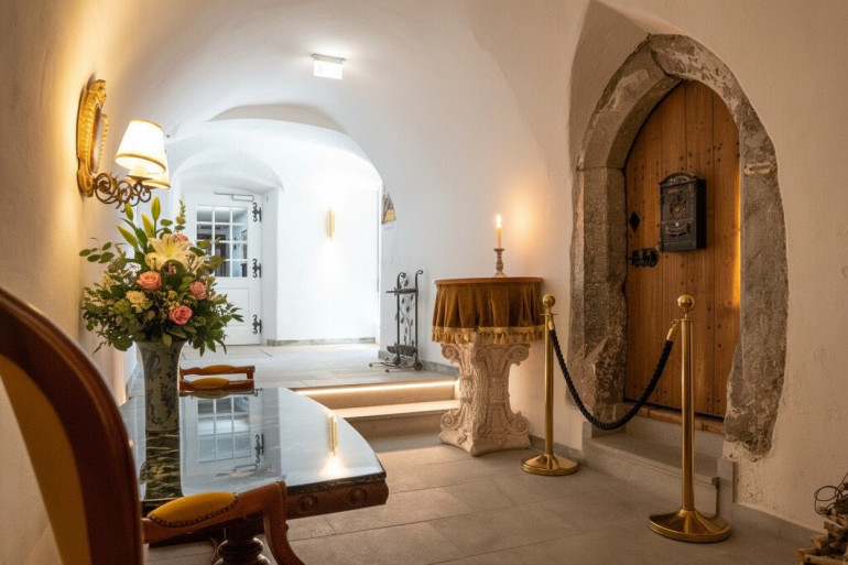 Der Kellerraum ist trocken, massiv gebaut und über originale Werkstein- und Holzstufen erschlossen. Die Gewölbedecke wurde im Zuge der Restaurierung behutsam gereinigt und mit Kalkputz ausgebessert, wobei die historischen Schalungsabdrücke bewusst erhalten blieben – ein Zeugnis handwerklicher Baukunst vergangener Jahrhunderte.