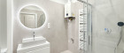 - Badezimmer mit Walk-Inn Dusche, Waschbecken, Waschmaschinenanschluss und Fenster