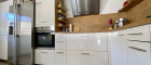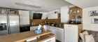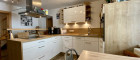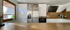 Großer Wohn-/Essbereich mit Zugang auf den Balkon. Möbliert mit einer modernen großen Einbauküche, Spots an der Decke.
