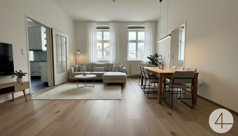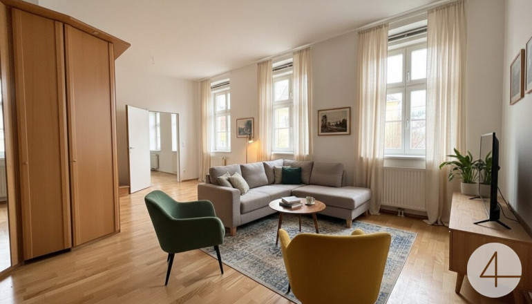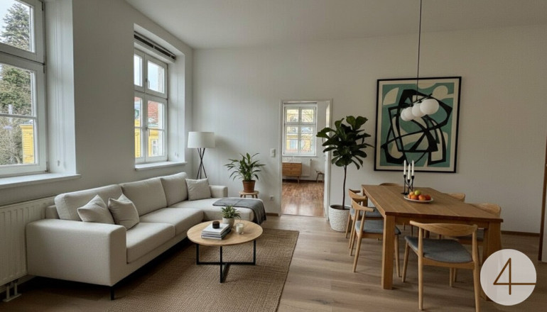 The great size results from combining two apartments, plus you have two entrances and could also separate the areas into living and sleeping areas (guest area and private area). The light-flooded rooms and the spacious layout make this apartment the ideal choice for a large family, students or as an apartment with a home office.