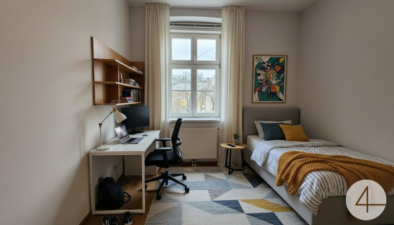 Die lichtdurchfluteten Räume und der großzügige Schnitt machen diese Wohnung zur idealen Wahl für eine große Familie, Studenten oder als Wohnung mit Home-Office.