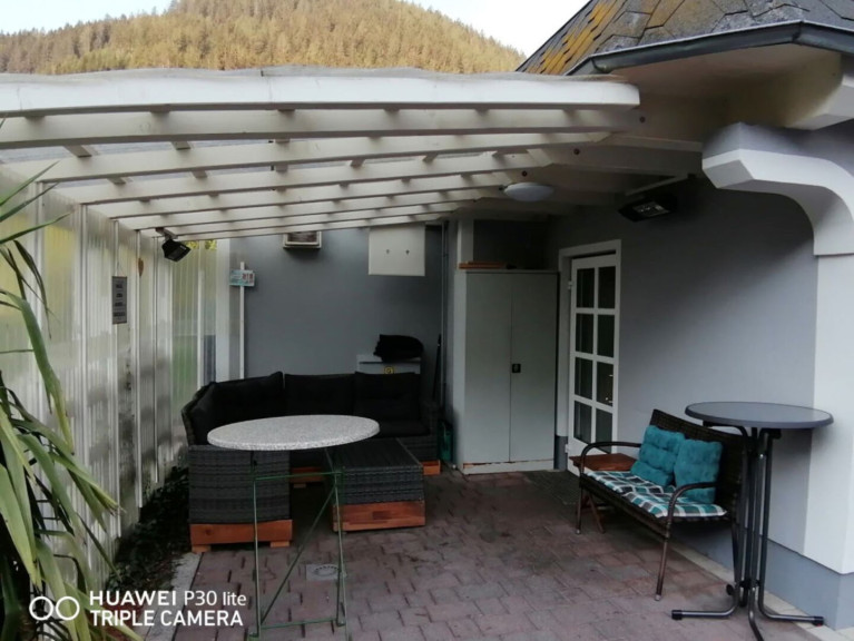 Das 591 m² große Grundstück ist nahezu vollständig mit robusten, farbigen Betonsteinen gepflastert, die auch für die Befahrung mit LKWs geeignet sind. Der Außenbereich wird hauptsächlich als Gastgarten genutzt und bietet ca. 50 teils überdachte Sitzplätze. Zusätzlich steht ein Festzelt zur Verfügung, das für größere Veranstaltungen aufgestellt werden kann und bis zu 100 weitere Sitzplätze bietet. Darüber hinaus kann der Außenbereich als großzügiger Parkplatz genutzt werden. Direkt gegenüber der Hauptstraße befinden sich weitere öffentliche Parkflächen.