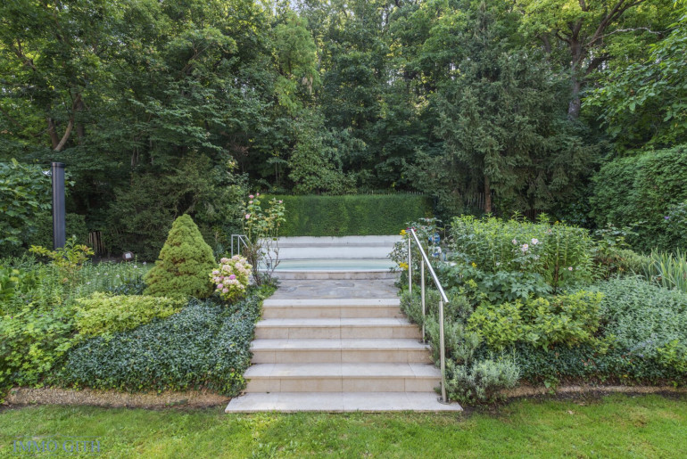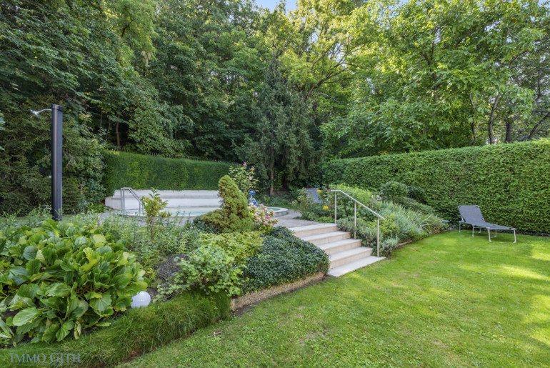 Über das innenliegende Stiegenhaus erreicht man das obere Geschoss, das gartenseitig auf Erdgeschossniveau liegt und den zentralen Wohnbereich bildet. Hier öffnet sich der lichtdurchflutete Wohnsalon mit offener Galerie zur Terrasse, in den wunderschön gestalteten Garten mit Pool, Wintergarten und Lounge-Area – ein Ort für entspannte Stunden und stilvolle Gastlichkeit. Die moderne Einbauküche lädt zum Kochen und Bewirten ein, der offen gestaltete Wohn-/Essbereich mit Wintergarten bietet ein einzigartiges Raumgefühl.