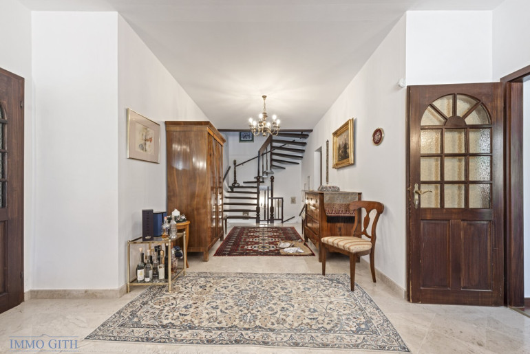 Die Villa wurde in durchdachter Hanglage errichtet und verfügt über drei Ebenen. Der Hauseingang befindet sich auf Straßenniveau, von wo man in den großzügigen Entreebereich im unteren Geschoss gelangt – ein idealer Empfang für Besucher oder Klienten. Dieser Bereich wurde bislang als Praxis genutzt und ist über einen eigenen Zugang separat begehbar, eignet sich jedoch ebenso gut als Wohnbereich für Gäste, ein Atelier oder eine Einliegerwohnung. Hier finden sich zwei großzügige Zimmer (z. B. Büro oder Ordination), eine praktische Teeküche, der Wellnessbereich mit Sauna, Dusche & WC, ein stilvoller Weinkeller sowie Technikräume und Waschküche.