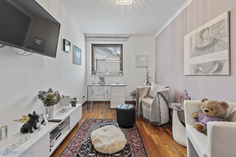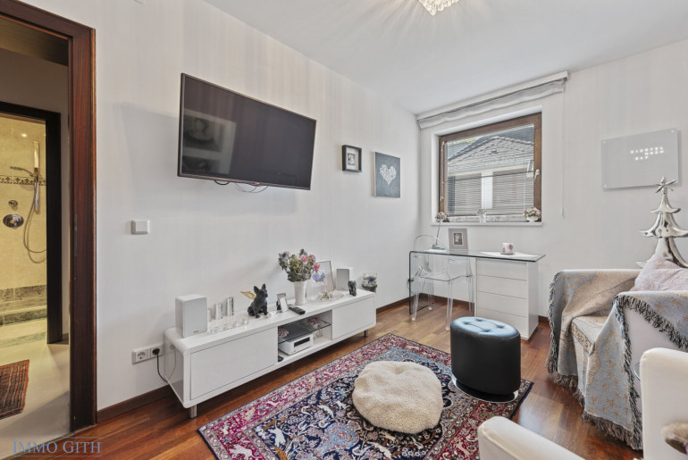 Im oberen Stockwerk befinden sich die privaten Räume: drei Schlafzimmer, eines davon mit Ensuite-Badezimmer und begehbarem Kleiderschrank, ein weiteres Badezimmer mit Dusche sowie ein separates WC. Das gesamte Haus überzeugt durch klare Architektur, viel Tageslicht, hochwertige Materialien und flexible Nutzungsmöglichkeiten.