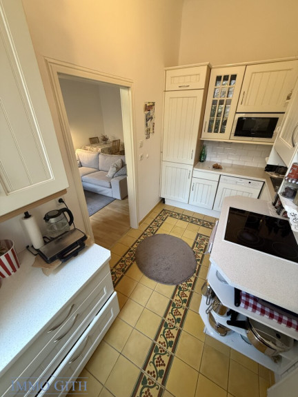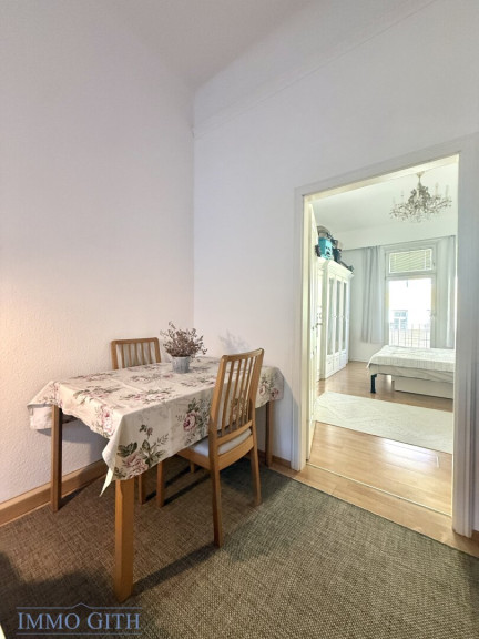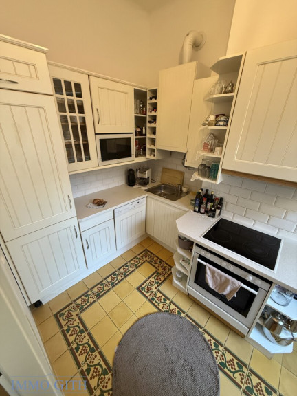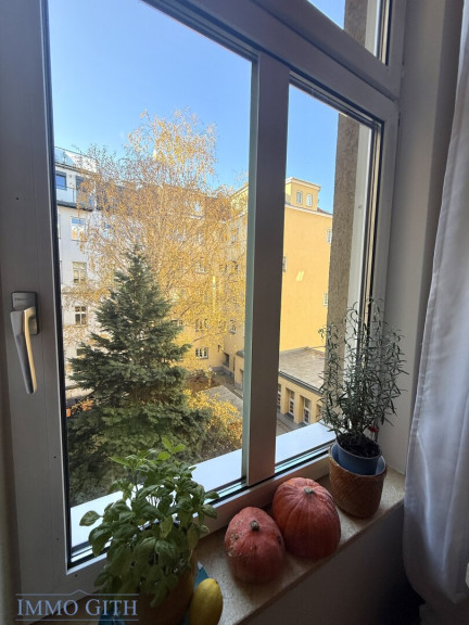 Über den Vorraum gelangt man in das separate WC mit Handwaschbecken sowie in das großzügige Wohnzimmer, das zum ruhigen Innenhof ausgerichtet ist und durch viel Tageslicht besticht. Von hier aus führen zwei Wege weiter: auf der einen Seite in das Schlafzimmer, das zur ruhigen Seitengasse orientiert ist und über einen kleinen Balkon verfügt – perfekt für den ersten Kaffee am Morgen oder einen Moment frischer Luft. Auf der anderen Seite gelangt man in die gepflegte Küche, von der aus das Badezimmer mit Dusche, Bidet und Fenster erreichbar ist – ein angenehmes Detail, das Licht und Frischluft garantiert.