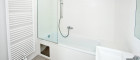 - Badezimmer mit Badewanne, Waschmaschinenanschluss und Toilette