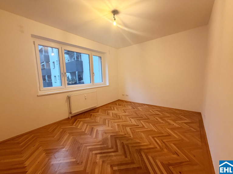Die Wohnung befindet sich im 1. Obergeschoß und verfügt über eine großzügiges Wohnzimmer mit Kochnische, drei helle, geräumige Schlafzimmer, ein Badezimmer mit Badewanne und Doppelwaschbecken und abgegrenzter Toilette, ein separates Gäste- WC, einen Abstellraum mit Waschmaschinenanschluss und einen Vorraum. Das Highlight ist der südwestlich ausgerichtete Balkon mit Loggia.