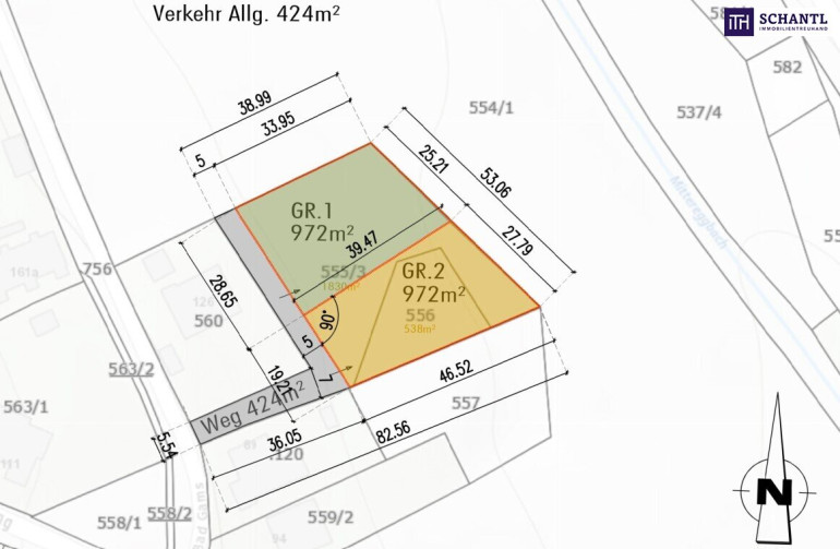 Wichtig ist noch, dass dieses Grundstück ein Bestandteil eines größeren Grundstücks ist, das im Zuge des Verkaufs geteilt wird. Im Zuge der Teilung entstehen zwei gleich große Grundstücke und eine Verkehrsfläche mit einem Ausmaß von 424 m². Diese Verkehrsfläche ist anteilig mitzuerwerben (d.h. 424 m² / 2 = 212m²) Die angeführten 1.184 m² Flächenausmaß ergeben sich aus 972 m² Teilfläche und dem 212 m² Anteil an der Verkehrsfläche.