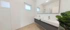 Badezimmer mit ebenerdiger Dusche, Doppelwaschbecken & Fenster