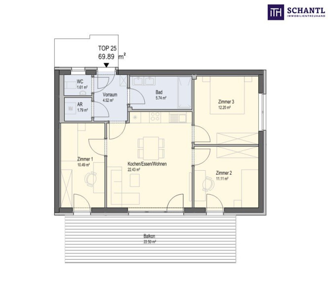 • 69,89 m² Wohnfläche + 22,50 m² sonnenverwöhnter Südbalkon