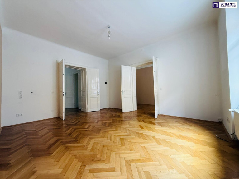 Authentischer Altbaucharakter: Fischgrätparkett, hohe Räumen und elegante Doppelflügeltüren.
