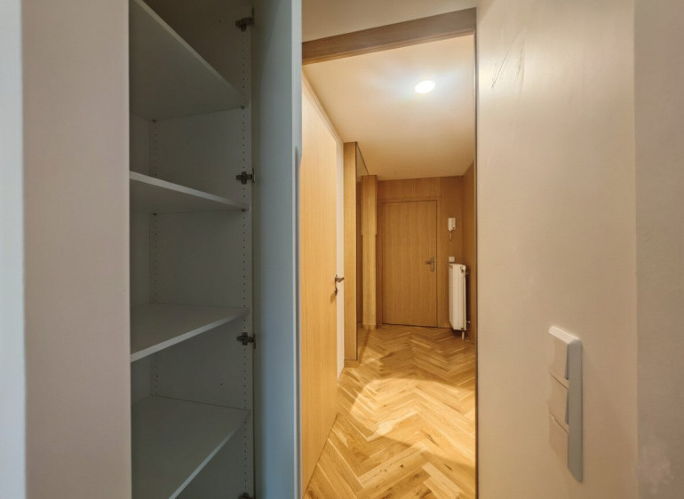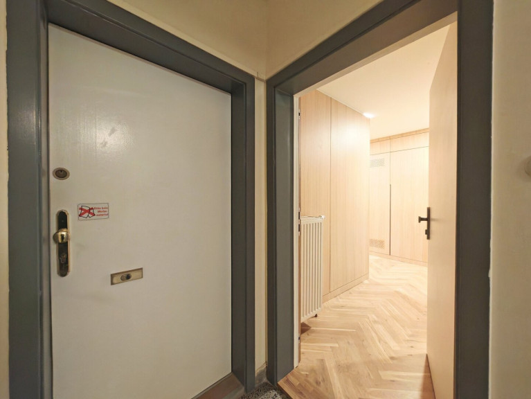 Diese Wohnung wurde kürzlich umfassend und stilvoll in modernem Design renoviert. Das gesamte Vorzimmer ist mit Holzvertäfelung ausgestattet, wodurch Zimmertüren und Stauraumlösungen harmonisch in die Wandgestaltung integriert werden. Dies sorgt für ein hochwertiges und zugleich wohnliches Ambiente. Die Raumaufteilung ist besonders effizient: Es wurden Garderoben sowie separate Schränke für Therme und Waschmaschine geschaffen, um jeden Quadratmeter optimal zu nutzen.
