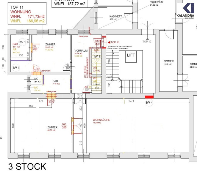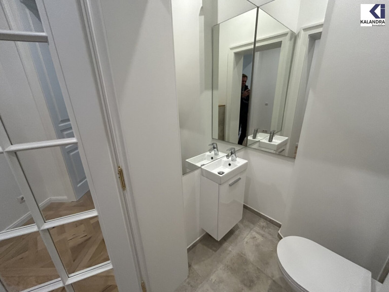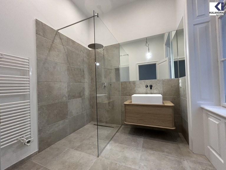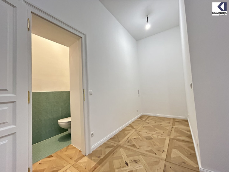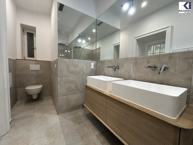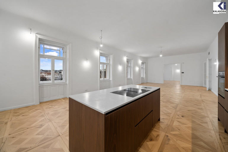 entrance hall (approx. 15m²), guest toilet, utility/ storage room, spacious living and dining room with open-plan kitchen (approx. 76m²) and southwest-facing views over "Schmerlingplatz", adjoining bedroom (approx. 41m²) with en-suite bathroom (approx. 7 m²) featuring a walk-in shower, double vanity, and toilet, further a courtyard-facing bedroom (approx. 20m²) with a walk-in closet corner, adjoining bathroom (approx. 7m²) with a walk-in shower and separate toilet.