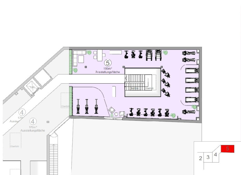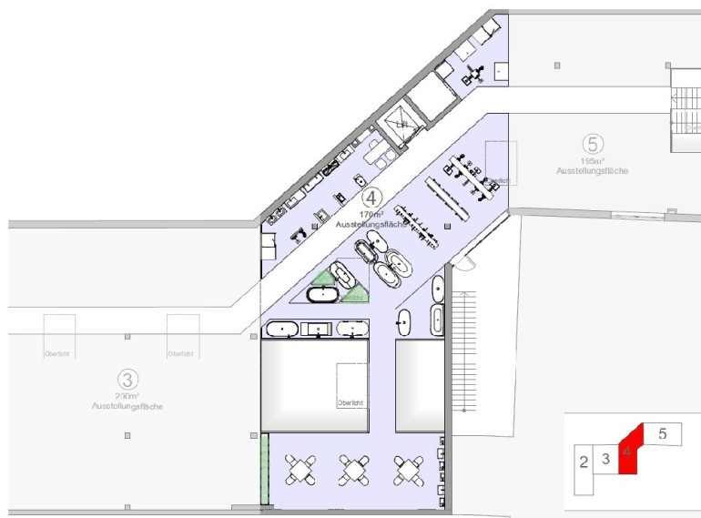 Durch die spielend leichte Flächenanpassung eignet sich die Fläche perfekt für Interior-, Design- und Bau(neben)gewerbeunternehmen, die ein professionelles Präsentationsumfeld suchen. Im Obergeschoss sind bereits Wasser- und Kanalanschlüsse vorbereitet. Die gesamte Fläche ist zudem mit Fußbodenheizung ausgestattet.