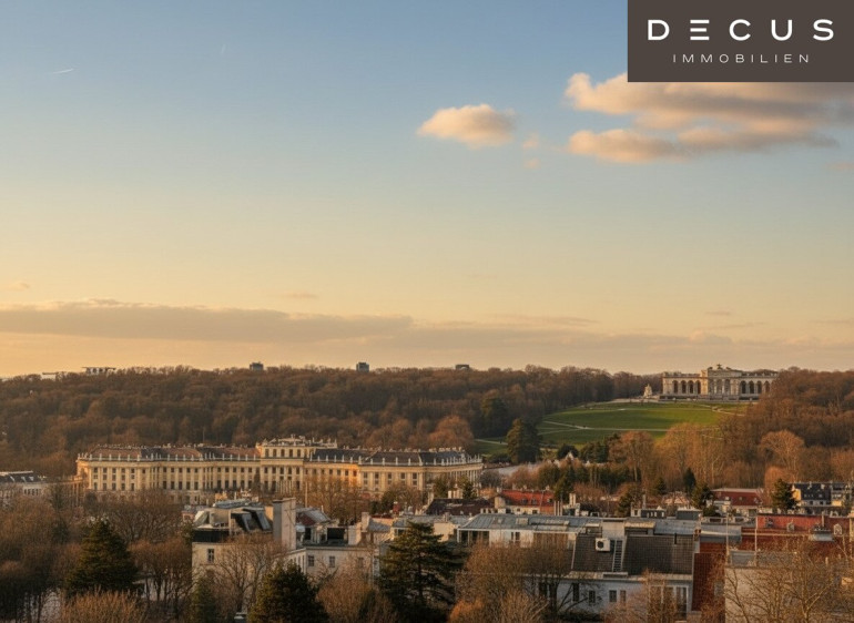 Im oberen Dachgeschoss befindet sich der offen gestaltete Wohn-, Koch- und Essbereich – ein heller, einladender Raum, der durch die große Terrasse nahtlos nach außen erweitert wird. Vom lichtdurchfluteten Wohnbereich aus eröffnet sich ein beeindruckender Ausblick auf die Gloriette, der dem Wohnraum eine ganz besondere Atmosphäre verleiht. Die großzügige Freifläche mit Lärche-Dielen bietet Platz für Lounge, Esstisch oder Pflanzen und schafft einen privaten Rückzugsort über den Dächern Penzings.
