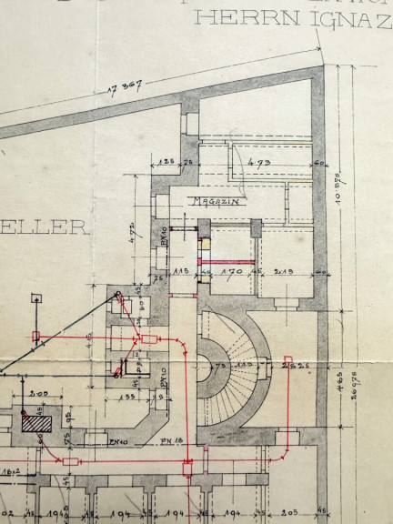 Das Magazin verfügt über eine Nutzfläche von insgesamt 35,36 m2 und ist über das Stiegenhaus über insgesamt 25 Stufen über den Hauskeller begehbar, die Strominstallationen wurden vor zwei Jahren neu hergestellt. Die Raumhöhe beträgt bis zum Gewölbe 3,03 Meter.