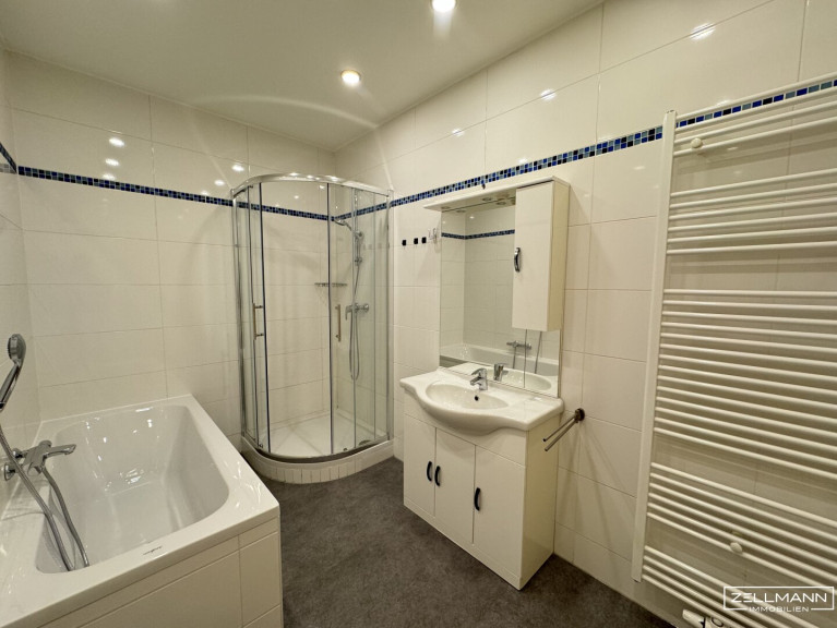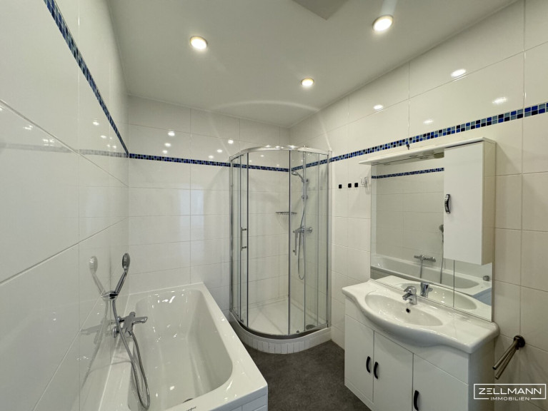 Die Wohnung verfügt über zwei zentral begehbare Zimmer, die sich flexibel als Schlafzimmer, Büro oder Gästezimmer nutzen lassen. Eines davon bietet direkten Zugang zur Terrasse – ideal für ruhige Momente an der frischen Luft. Das zwischen den Zimmern gelegene Badezimmer wurde komplett saniert und präsentiert sich modern, hell und hochwertig ausgestattet.