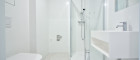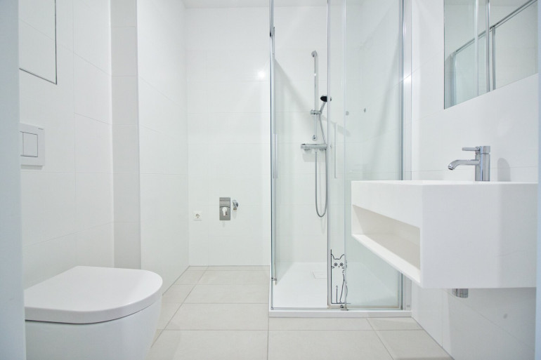 - Badezimmer mit Dusche, Waschbecken, Handtuchheizkörper, WC & Waschmaschinenanschluss
