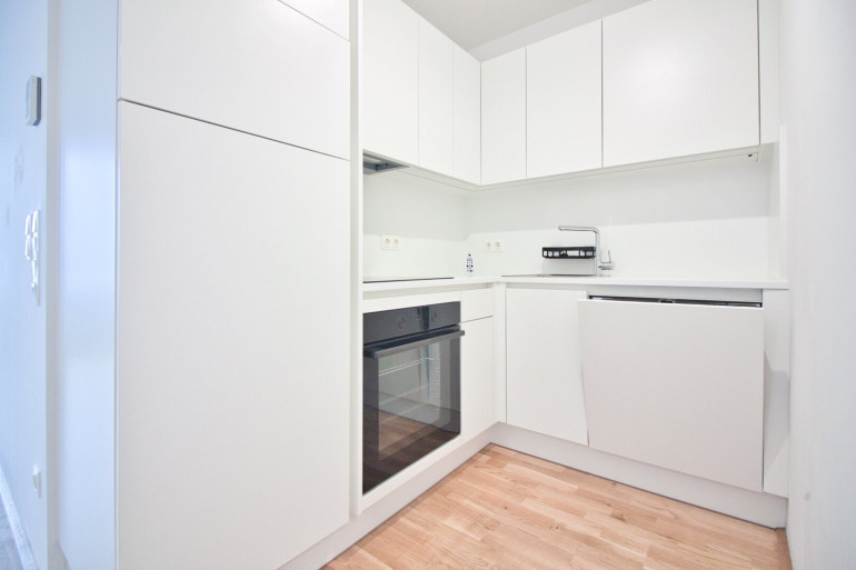 Geradeaus geht es in die große, lichtdurchflutete Wohnküche mit ca. 18 m². Diese ist bereits mit einer modernen Küche voll ausgestattet und bietet einen Ausgang auf einen ca. 4,5 m² großen Balkon. Neben dem Balkon befindet sich der Eingang in das 8 m² große Schlafzimmer.