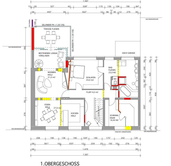 Zusätzlich stehen ein Wintergarten im Erdgeschoss (ca. 20m²) und eine Terrasse im 1. Obergeschoss (ca. 15m²) zur Verfügung.