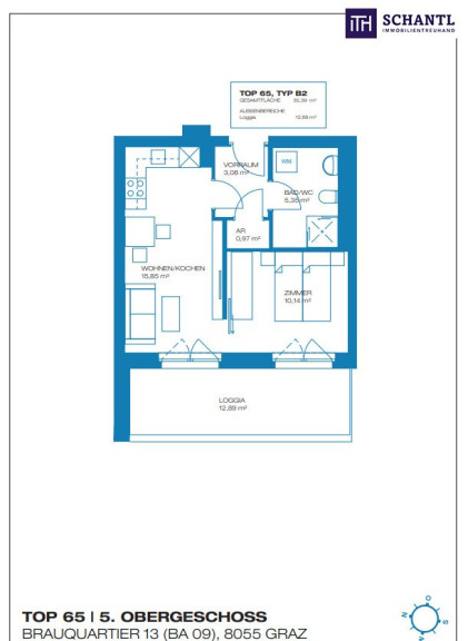 Diese charmante Wohnung im 5. Obergeschoss überzeugt mit einer idealen Wohnfläche von 35,39 m², perfekt für Singles oder Paare. Genießen Sie die Abendsonne dank West-Ausrichtung und einen lichtdurchfluteten Wohnbereich mit integrierter, moderner Küche – ideal für Hobbyköche. Das geräumige Schlafzimmer und das hochwertige Badezimmer mit Dusche sorgen für Komfort und Entspannung. Besonderes Highlights, die 12,89 m² große Loggia lädt zu erholsamen Stunden ein. Zusätzlich profitieren Sie von einem praktischen Kellerabteil, effizienter Nahwärme-Heizung und niedrigen Betriebskosten.