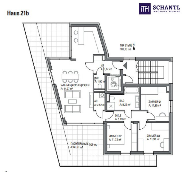 - Wohn/Kochen/Essen mit 44,07m² sehr moderner Schnitt mit einer schrägen Wand
