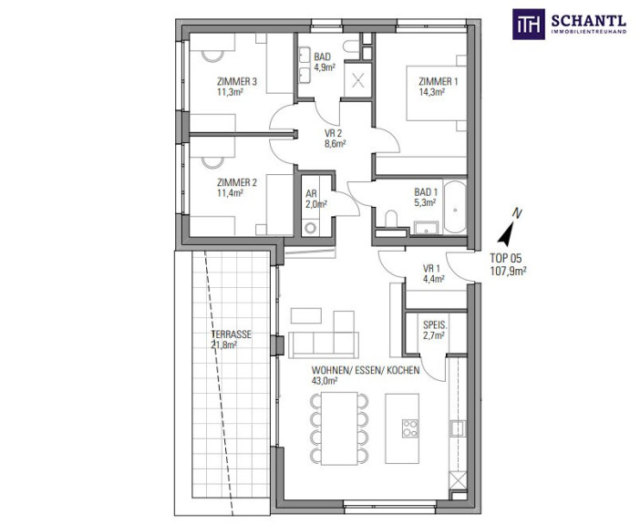 - WO/ESS/KO auf 43m² und der anschließenden Terrasse mit 21,8m²
