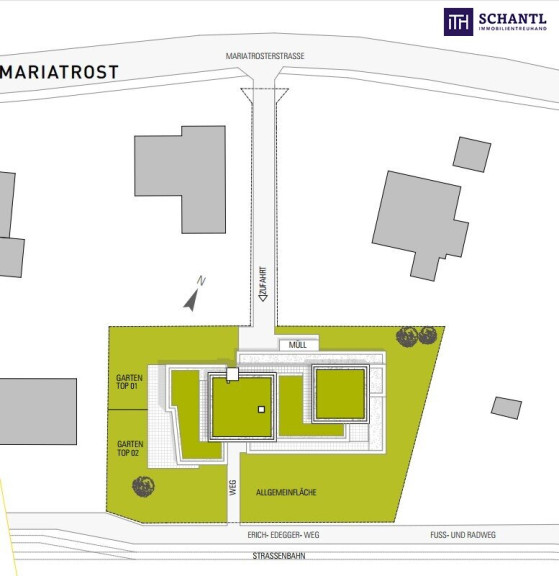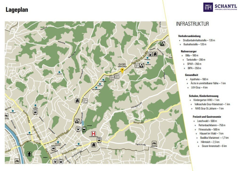 Die Wohnung in der Maria Troster-Straße 146 befindet sich in einer der begehrtesten Wohngegenden von Graz, dem Stadtteil Mariatrost. Die Lage bietet eine perfekte Kombination aus ruhigem, naturnahem Wohnen und schneller Anbindung an das Stadtzentrum. Mariatrost ist bekannt für seine grüne Umgebung und den hohen Freizeitwert. Die Lage ist ideal für Natur- und Sportliebhaber: Zahlreiche Wanderwege und der beliebte Leechwald sind in der Nähe, ebenso wie der Grazer Hausberg, der Schöckl, der zahlreiche Outdoor-Aktivitäten ermöglicht. Die Basilika Mariatrost, ein bedeutendes Wahrzeichen von Graz, ist ebenfalls nur wenige Minuten entfernt und verleiht dem Stadtteil seinen besonderen Charme. In der unmittelbaren Umgebung befinden sich diverse Einkaufsmöglichkeiten, wie Supermärkte, Apotheken und Bäckereien, die den täglichen Bedarf decken. Die Nahversorgung wird ergänzt durch kleine Cafés und Restaurants, die zum Verweilen einladen. Außerdem gibt es Kindergärten, Schulen und Sporteinrichtungen in der Nähe, was die Lage besonders für Familien attraktiv macht. Die Anbindung an den öffentlichen Nahverkehr ist hervorragend: Die Straßenbahnlinie 1 sowie mehrere Buslinien sind schnell erreichbar und bieten eine bequeme Verbindung ins Zentrum von Graz. Die Maria Troster Straße selbst ist gut an das Straßennetz angeschlossen, was eine schnelle Fahrt in die Innenstadt oder zu weiteren Ausflugszielen rund um Graz ermöglicht. Die Maria Troster Straße 146 ist eine ideale Adresse für alle, die eine ruhige und grüne Wohnlage suchen, ohne auf die Annehmlichkeiten des städtischen Lebens verzichten zu müssen. Die Mischung aus urbanem Komfort und Naturnähe macht diese Lage besonders attraktiv und lebenswert.