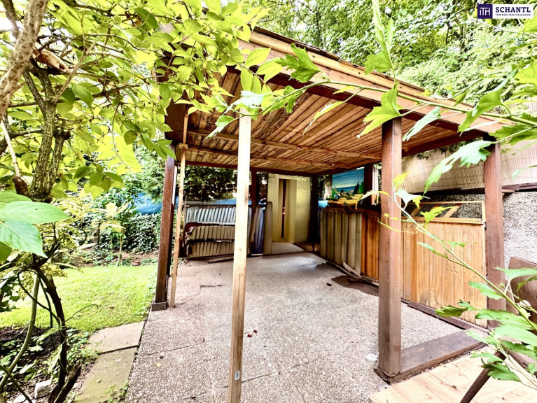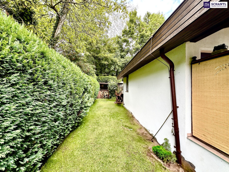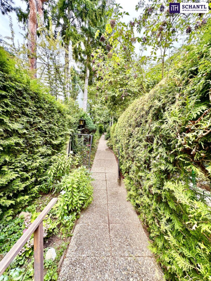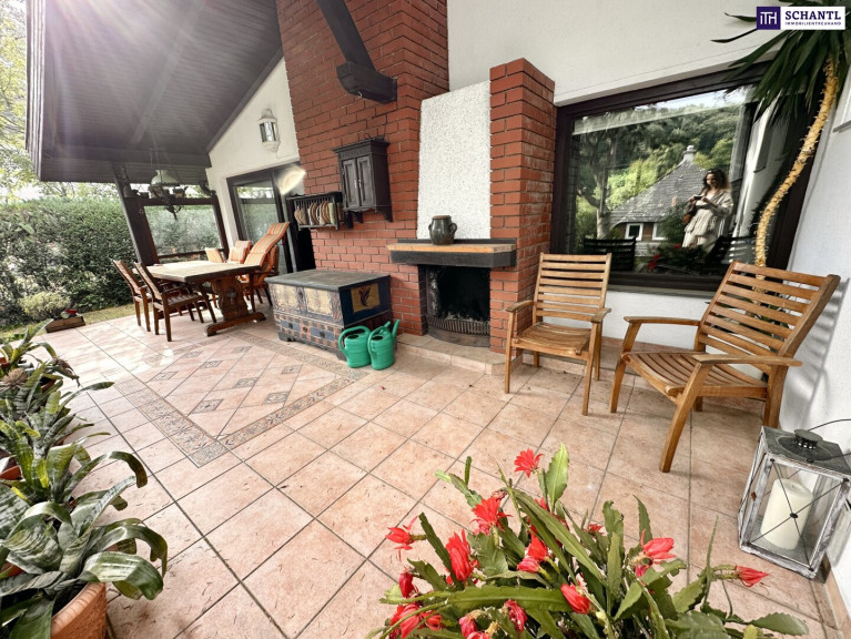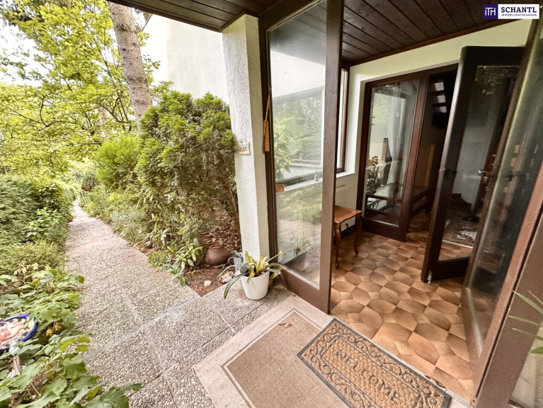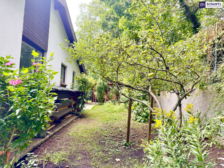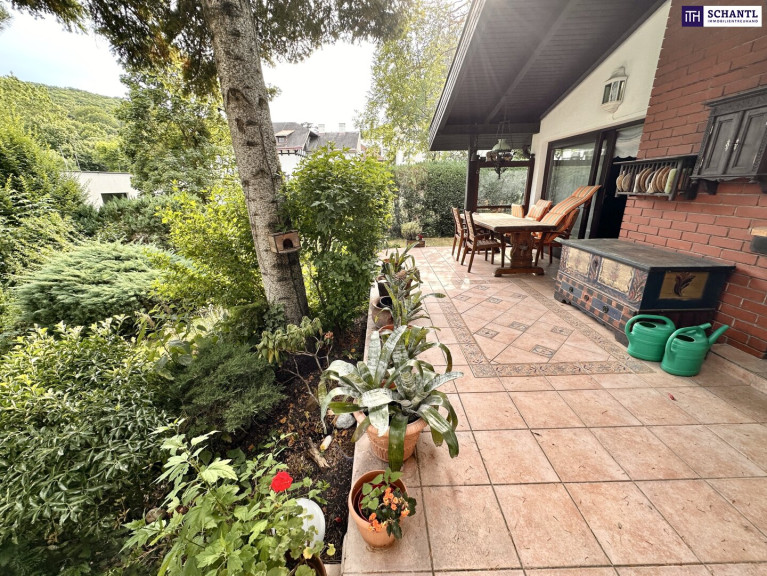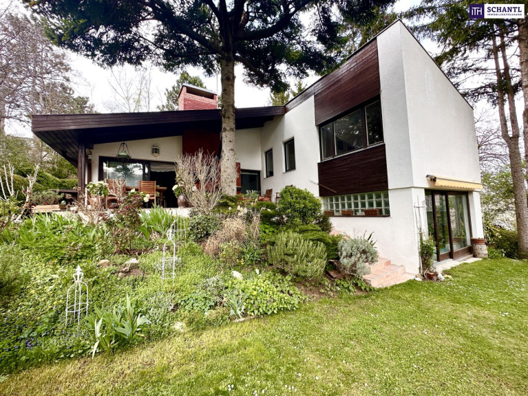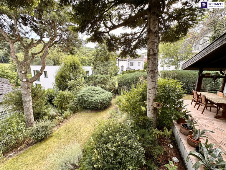 Die Villa liegt in erhöhter Lage an einem Südhang, vom Straßenlärm geschützt, und ist über einen kurzen Weg, der Garage und Wohnhaus verbindet, zugänglich. Der Wienerwald beginnt vor der Haustüre und doch sind alle Annehmlichkeiten wie Einkaufsmöglichkeiten, Kindergarten und Schule, Arzt und Apotheke sowie öffentliche Verkehrsmittel in unmittelbarer Nähe. Die Villa ist von einem gepflegten, blühenden Garten umgeben.