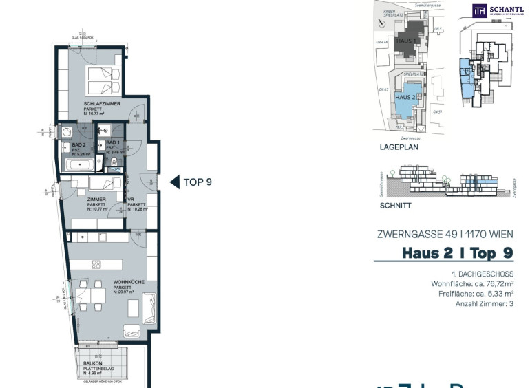 76,72 m² Wohnfläche | 5,33 m² Freifläche | 3 Zimmer | Provisionsfrei!