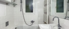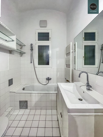 - 1 Badezimmer mit WC, Waschtisch samt Unterschrank und Spiegel, Badewanne, Handtuchheizkörper, Wandregal sowie einem Fenster (Lüftungshof)
